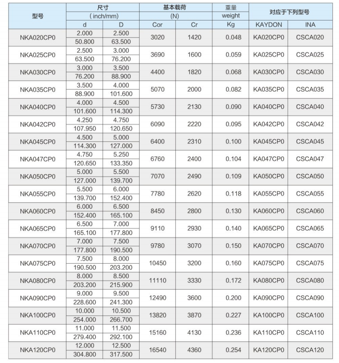The NKA020CP0 is a deep-groove ball thin-section bearing designed specifically for rotating components in precision instruments, such as indexing tables. The series features a constant cross-sectional height and includes multiple variants: NKA025CP0, NKA030CP0, NKA035CP0, NKA040CP0, NKA042CP0, NKA045CP0, NKA047CP0, NKA050CP0, and others. Among these, the NKA020CP0 is one of the representative models of Luoyang Thin-Walled Precision Bearing Co., Ltd.’s KA-series deep-groove ball constant-section thin-section bearings and serves as a direct replacement for INA’s CSCA020 bearing.
